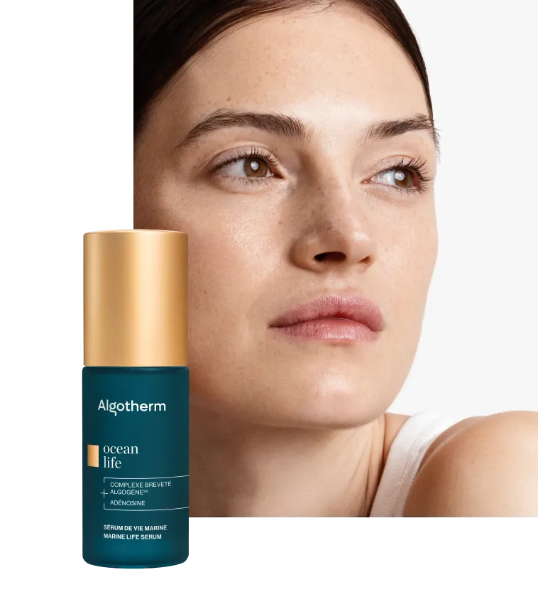 Ocean Life is the ultimate global anti-aging solution: proven results, visible from the first days, thanks to a complete treatment protocol designed to target all signs of aging simultaneously. These treatments strengthen the skin barrier, stimulate cell regeneration, improve elasticity, and neutralize oxidative stress, providing a true rejuvenating effect for visibly younger skin. A flagship bestseller of the brand, its effectiveness relies on formulas highly concentrated in targeted dermocosmetic actives and ALGOGÈNE[4], Algotherm’s ultra-performing patented marine complex, the result of years of research.