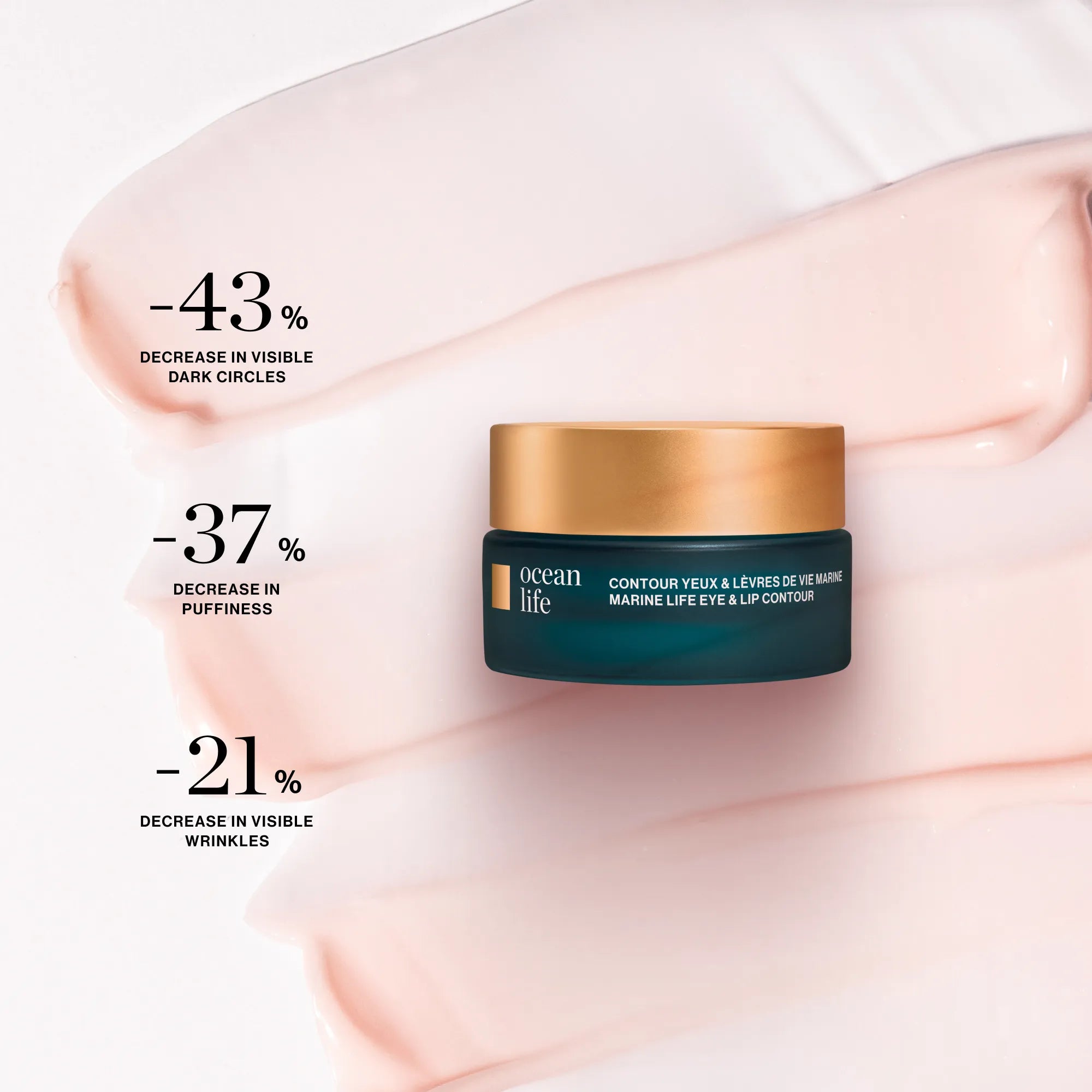 -43% visible dark circles, -37% visible puffiness, -21% visible wrinkles. (1)